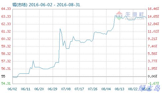 8月31日錫(市場(chǎng))商品指數(shù)為63.11,較昨日下降了0.25點(diǎn),較周期內(nèi)最高點(diǎn)100.25點(diǎn)(2011-09-05)下降了37.05%,較2015年12月09日最低點(diǎn)42.86點(diǎn)上漲了47.25%。(注:周期指2011-09-01至今)